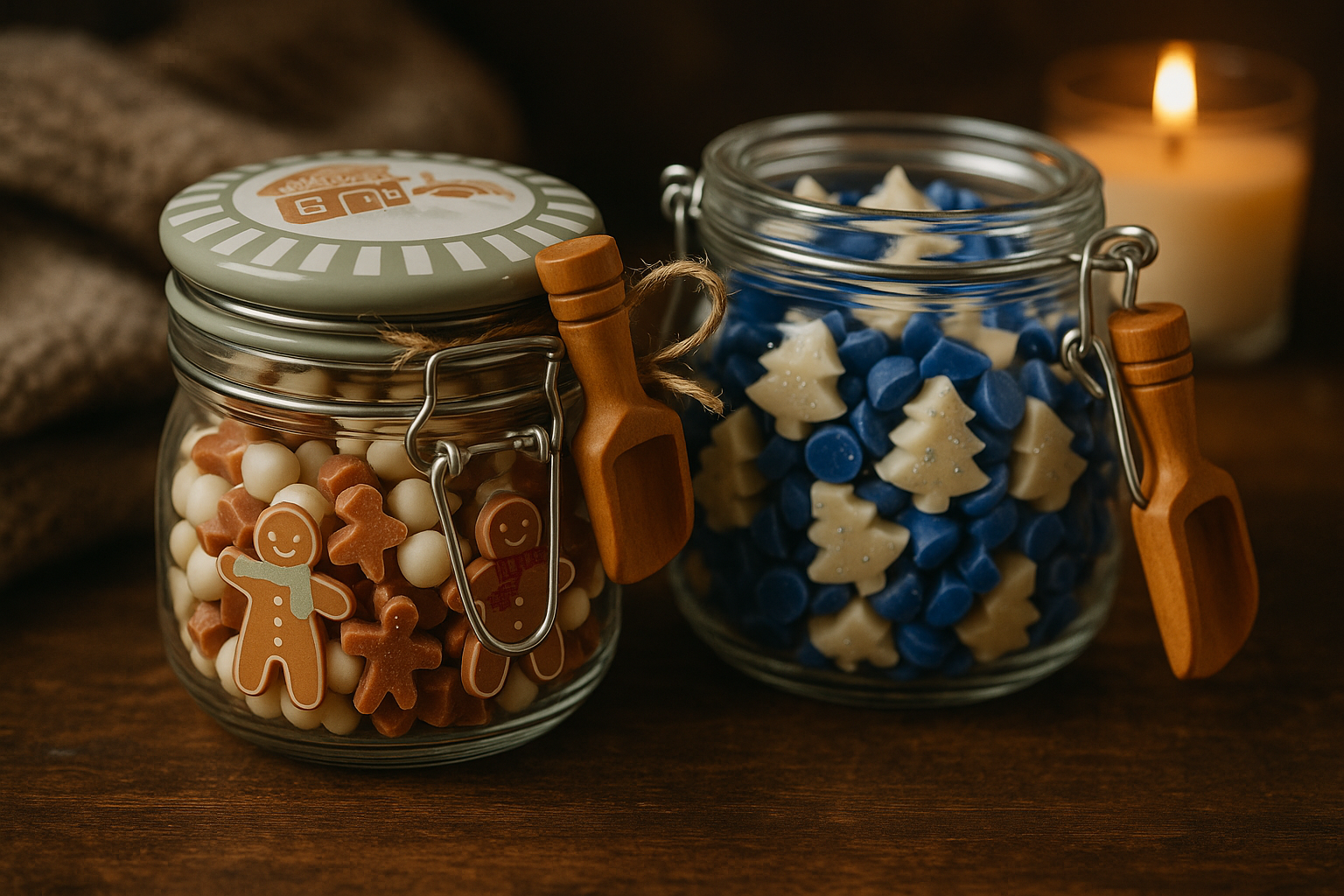 Get into the festive spirit with our Christmas Scoopie Jars! Each jar features a fun and unique design, one with a gingerbread theme and the other with an iridescent snowflake pattern. Both jars are filled with a mix of scoopie wax beads and fedtove shapes, perfect for making your holiday season extra cozy and fragrant!