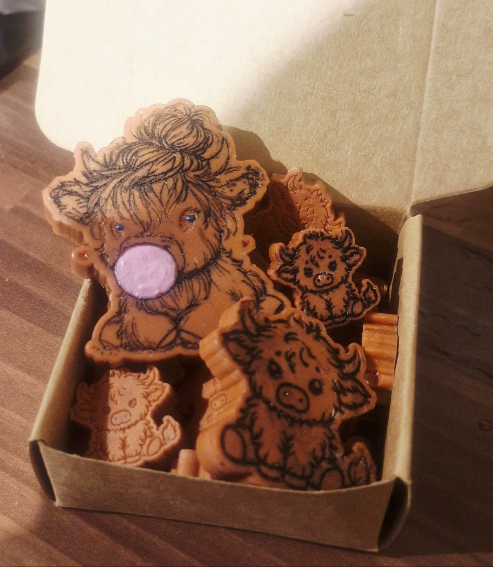 Get mooved by these Highland Cow mini Melts! These adorable melts are shaped like the iconic Highland cow, adding a quirky touch to your home decor. With their unique shape and scent, these mini melts will make your home feel cozy and inviting. Don't miss out on this fun and playful addition to your wax melt collection.