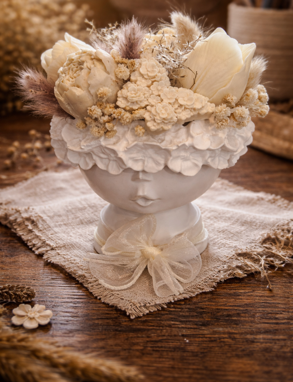 Introducing our Kiss Me Girl Bouquet — a truly enchanting scented décor piece designed to capture beauty, elegance, and romance. This stunning creation features a sculpted girl vase adorned with delicately crafted scented wax flowers, soft botanical details, and a charming butterfly accent, creating a graceful and whimsical display.