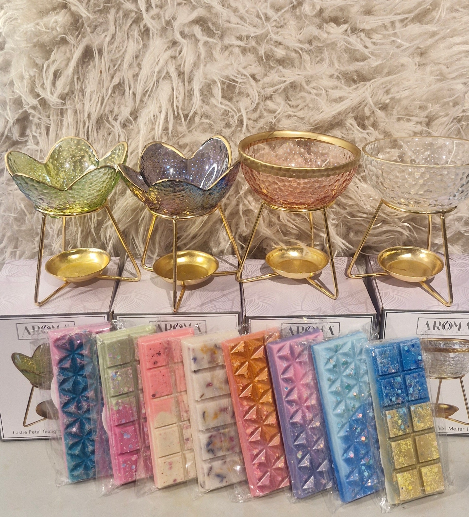 Indulge in the cozy ambiance of our Tealight & Snapbar Bundle, complete with a tea light burner and 4 mystery snapbars. Melt away the stress of the day and discover the delightful scents waiting for you. Create a calming atmosphere in any room and treat yourself to a moment of bliss.